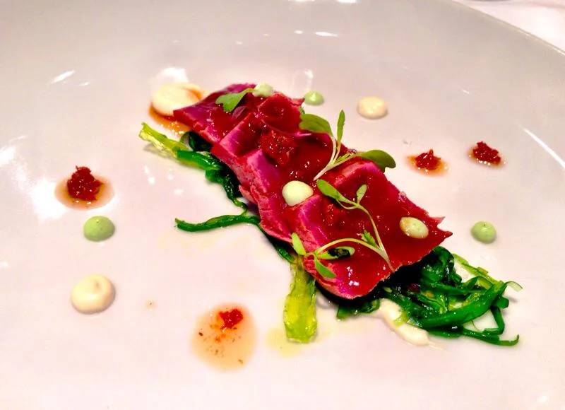 Ahi with wakame, dried tomato tapenade, and ajo blanco at Casa Pedro in Zaragoza