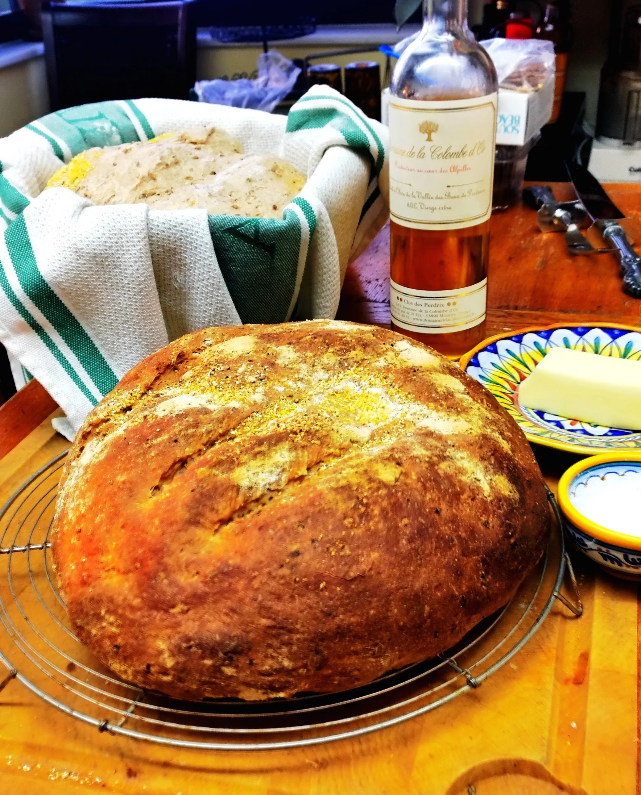 My spent grain loaf, baked in the foreground an a risen loaf about to be put on the baking stone in the background, with the best accompaniments: salt, butter and olive oil