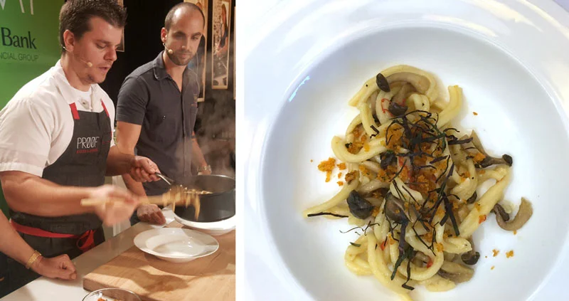 Chefs Justin Flit (l) and Brian Nasajon (r) and their gemelli with hon shimeji mushrooms (Photo: VeritageMiami)