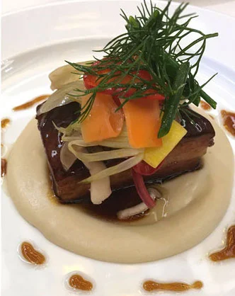 The umami-laden Pork Belly with Umeboshi Glaze and Dashi Poached Turnip Purée (Photo: VeritageMiami)
