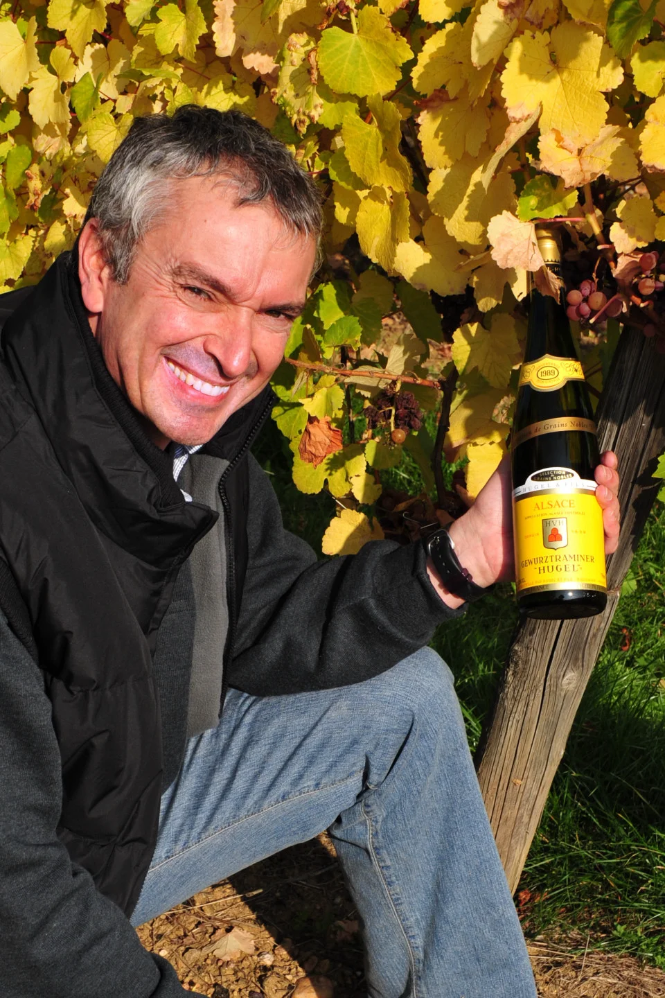 Etienne Hugel in the vineyard at the end of harvest with a bottle of gewurztraminer (Photo: Hugel)