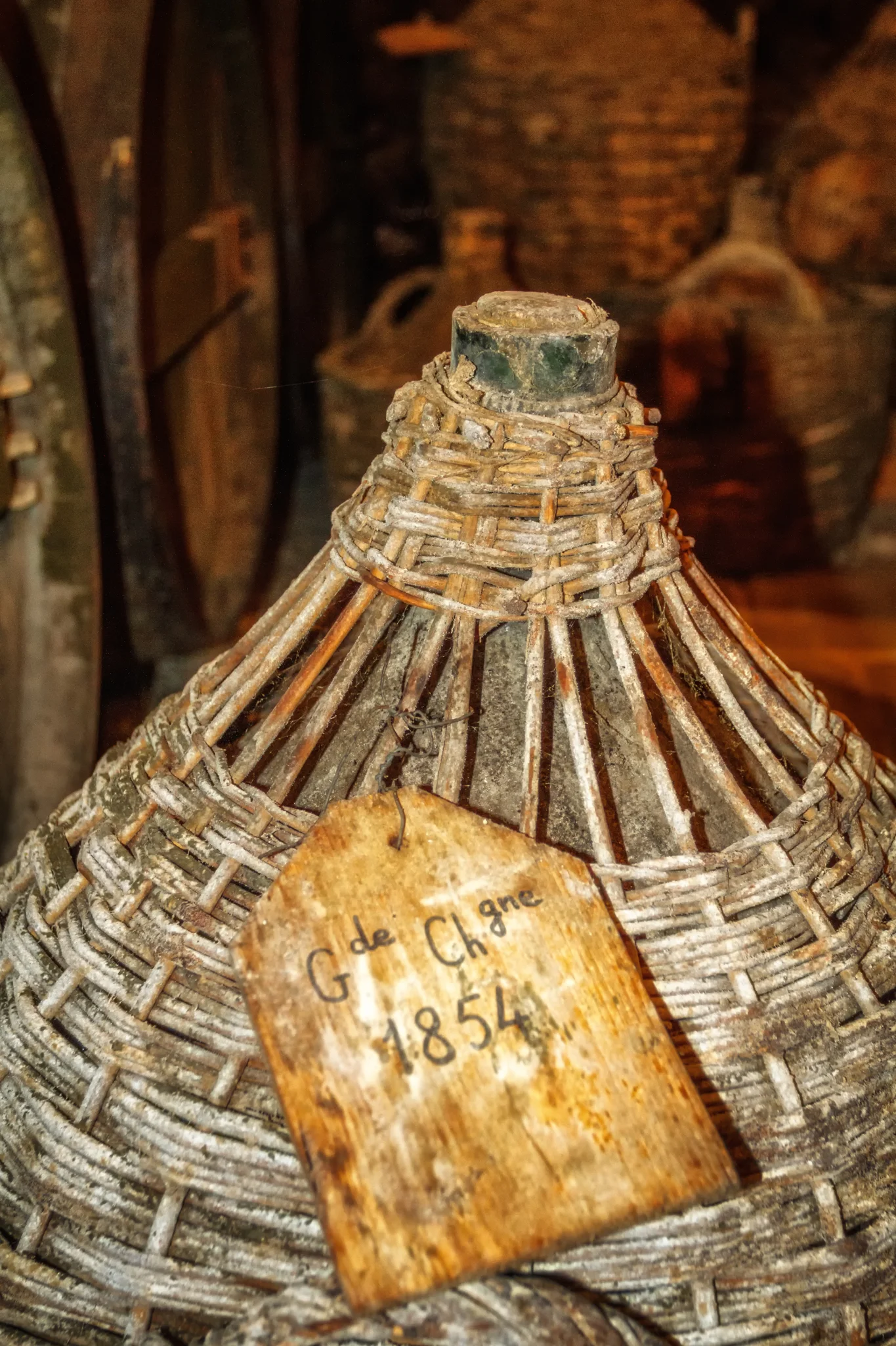 A wicker-clad Dames-Jeanne of 1854 Cognac in the Paradis of Cognac Hardy (Photo Lyn Farmer)