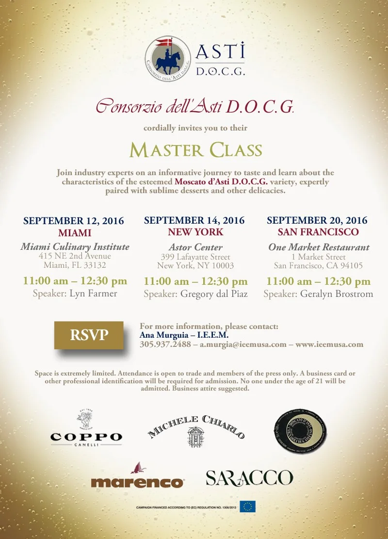 Moscato is a lovely and under-appreciated wine from Italy's Piedmont region - it's off-dry, often a little spritzy and nearly always a delightful drink. It has a more serious side that I look forward to exploring when I lead a masterclass featuring six very well-made moscatos and some fascinating food pairings. If you are in the wine trade, you are invited to attend - the the invitation below for details.